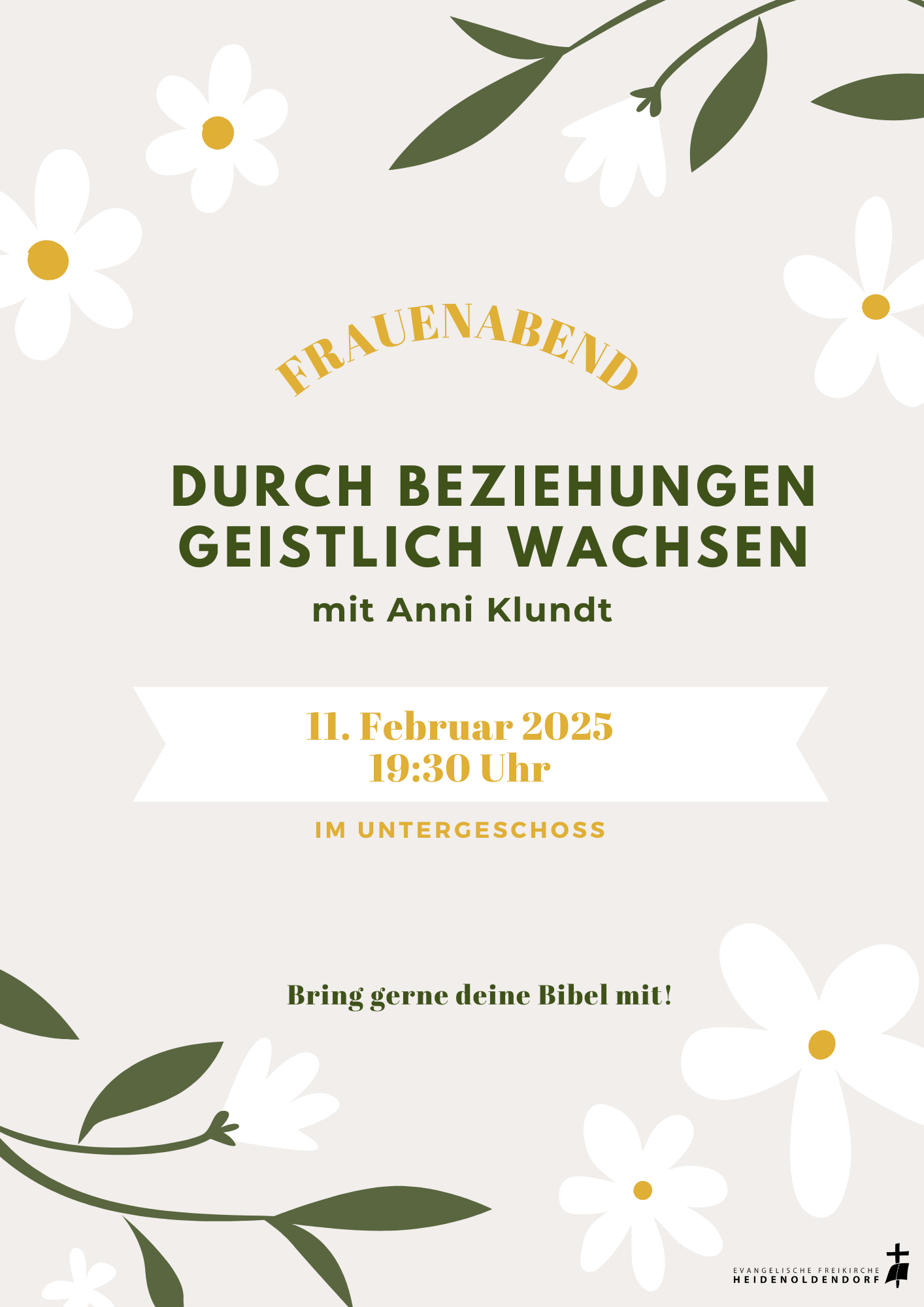 wir haben ein wenig vorgeplant und können euch (unverbindlich) schonmal die Termine für das 1. Halbjahr 2025 verraten. Merkt sie euch vor! Ihr findet die aktuellen Termine und Neuigkeiten der FRAUEN (immer) unter frauen.freikirche-hd.de.
