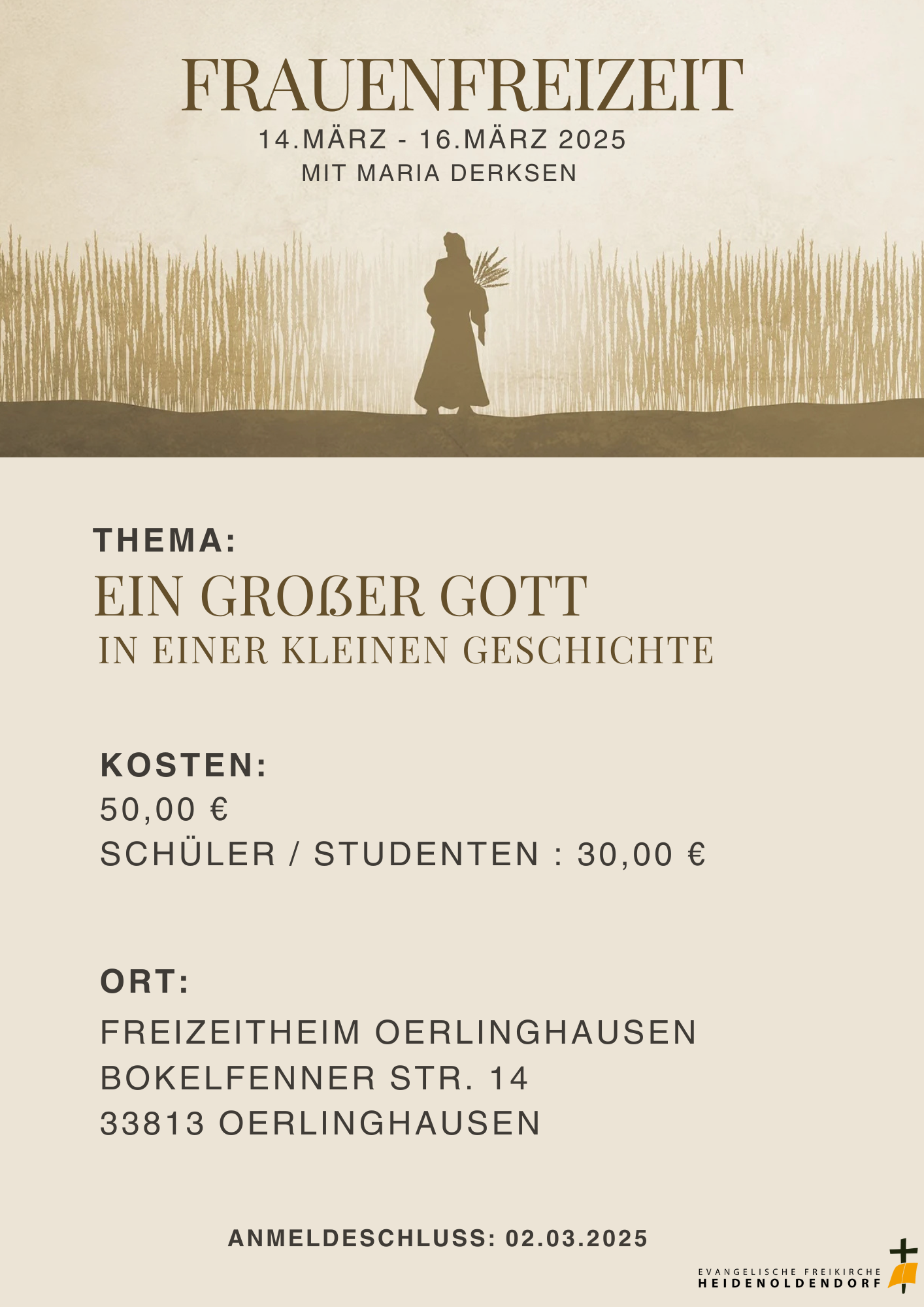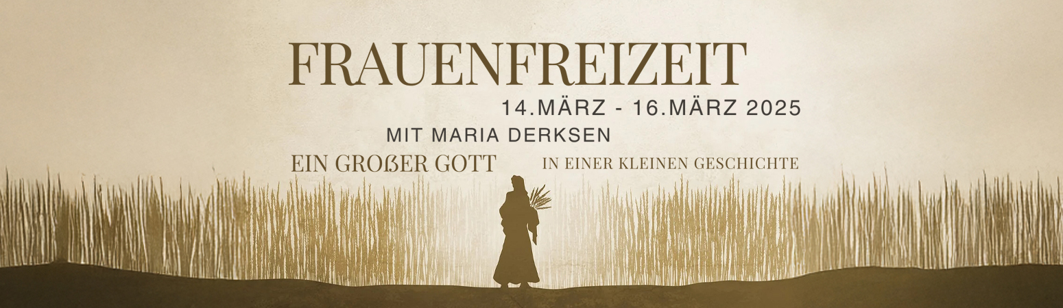 Wenn du den Begriff, kleine Geschichte der Bibel hörst, woran denkst du? Vielleicht hat dir das Bild schon alles verraten, oder du rätselst noch. Dieses Buch in der Bibel wird auch als die perfekte Kurzgeschichte betitelt. Wenn wir dich jetzt neugierig gemacht haben, dann melde dich doch zur Frauenfreizeit an. Wir haben Maria Derksen als Rednerin für die Freizeit eingeladen und mit ihr gemeinsam wollen wir den großen Gott in der kleinen Geschichte der Bibel erörtern. Des Weiteren haben wir noch Workshops, freie Zeit für Gemeinschaft und Spaziergänge eingeplant.