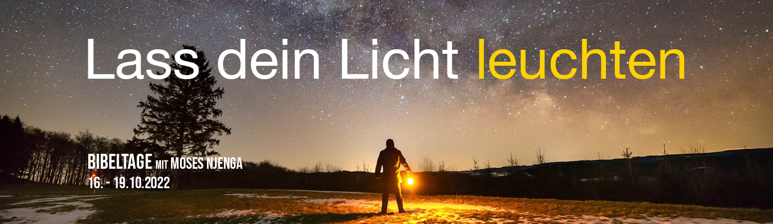 "Ihr seid das Licht der Welt" - Diese Worte sagt Jesus zu denen, die von dem Licht des Evangeliums erhellt wurden. Und wer Jesus kennt, der trägt das Licht des Evangeliums in die dunkle Welt. Wir laden herzlich zu den Bibeltagen ein, in denen Moses Njenga darüber sprechen wird, wie wir als Kinder des Lichts authentisch in einer dunklen Welt leben können, damit die Welt Jesus als das Licht dieser Welt kennenlernen kann.