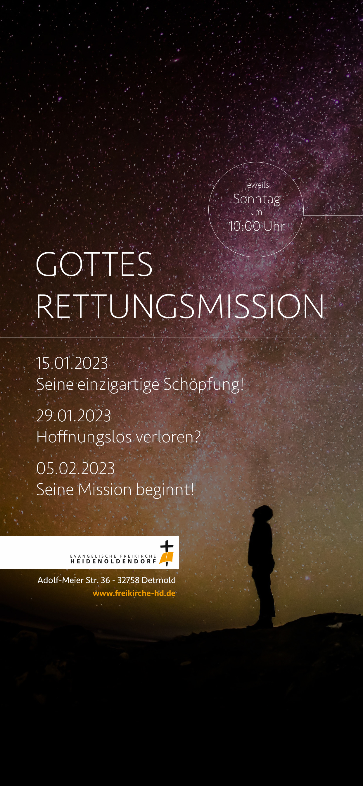 Die ersten zwölf Kapitel in der Bibel haben eine besondere Funktion. In diesen Kapiteln lesen wir, wie Gott die Welt samt den Menschen erschafft, diese Schöpfung aber ihre Herrlichkeit verliert und Gott wieder beginnt, seine Rettungsmission zu starten, um den Menschen zu retten. Doch was ist denn da eigentlich passiert? Wieso musste Gott den Menschen retten? Wir wollen uns an drei Sonntagen Zeit nehmen, an den wir uns mit GOTTES RETTUNGSMISSION beschäftigen - ein mal die perfekte Schöpfung anschauen. Der Mensch hat eine Bestimmung, doch diese kann er durch die Sünde nicht mehr ausleben, denn Sünde lässt trennt ihn von der Beziehung zu seinem Schöpfer. Aber in dieser Trennung schickt Gott einen Hoffnungsschimmer auf den Rettung und Wiederherstellung, den Schlangentreter. Kurz nach der größten Katastrophe der Menschheit, in diese so düstere Zeit verheißt Gott jemanden, der die Sünde besiegen wird. Ab Kapitel zwölf beginnt Gott ganz aktiv diesen Rettungsplan in die Tat umzusetzen. Seid gerne mit dabei, wenn wir in unseren nächsten Gottesdiensten über Gott und seinen Rettungsplan nachdenken wollen. Sie sind herzlich eingeladen! Nachfolgend die Übersicht der Veranstaltungen: