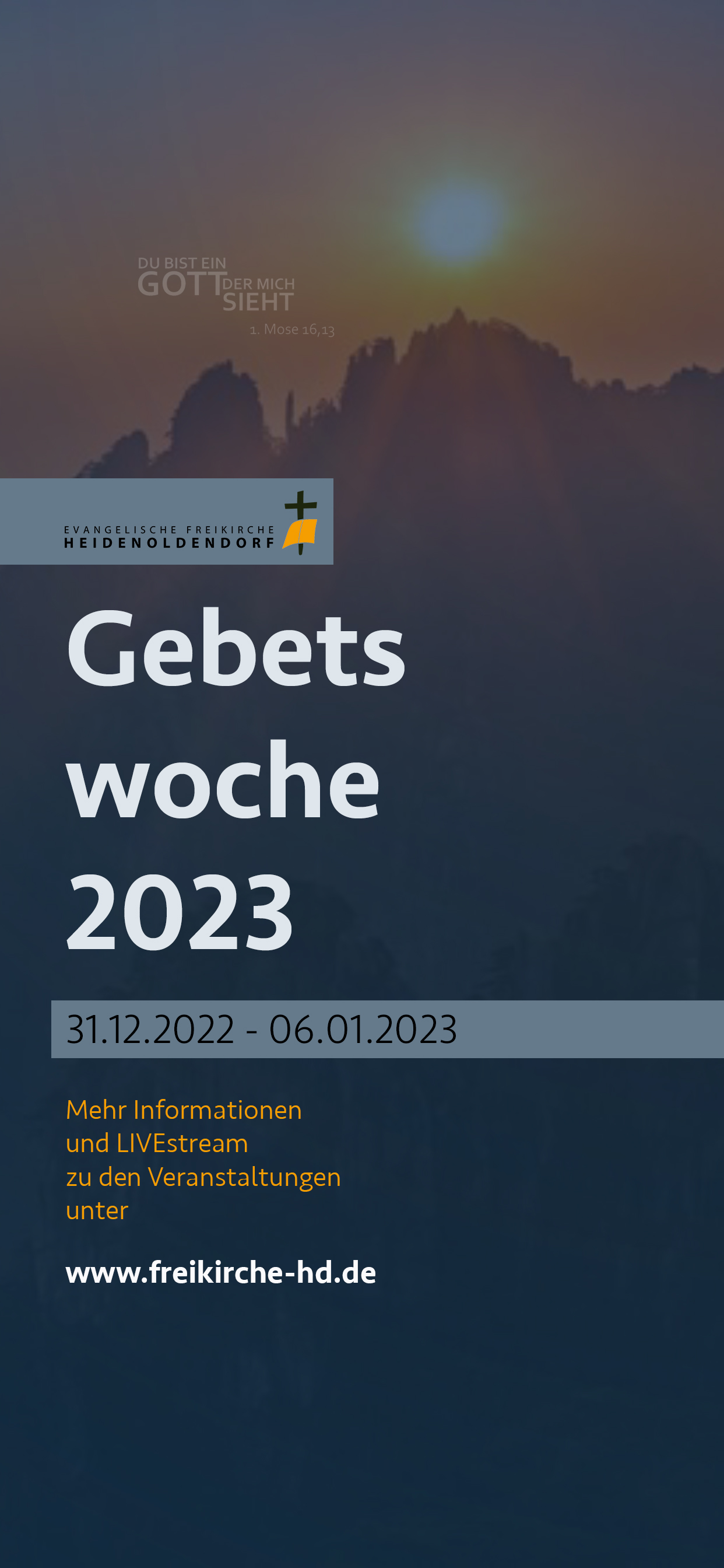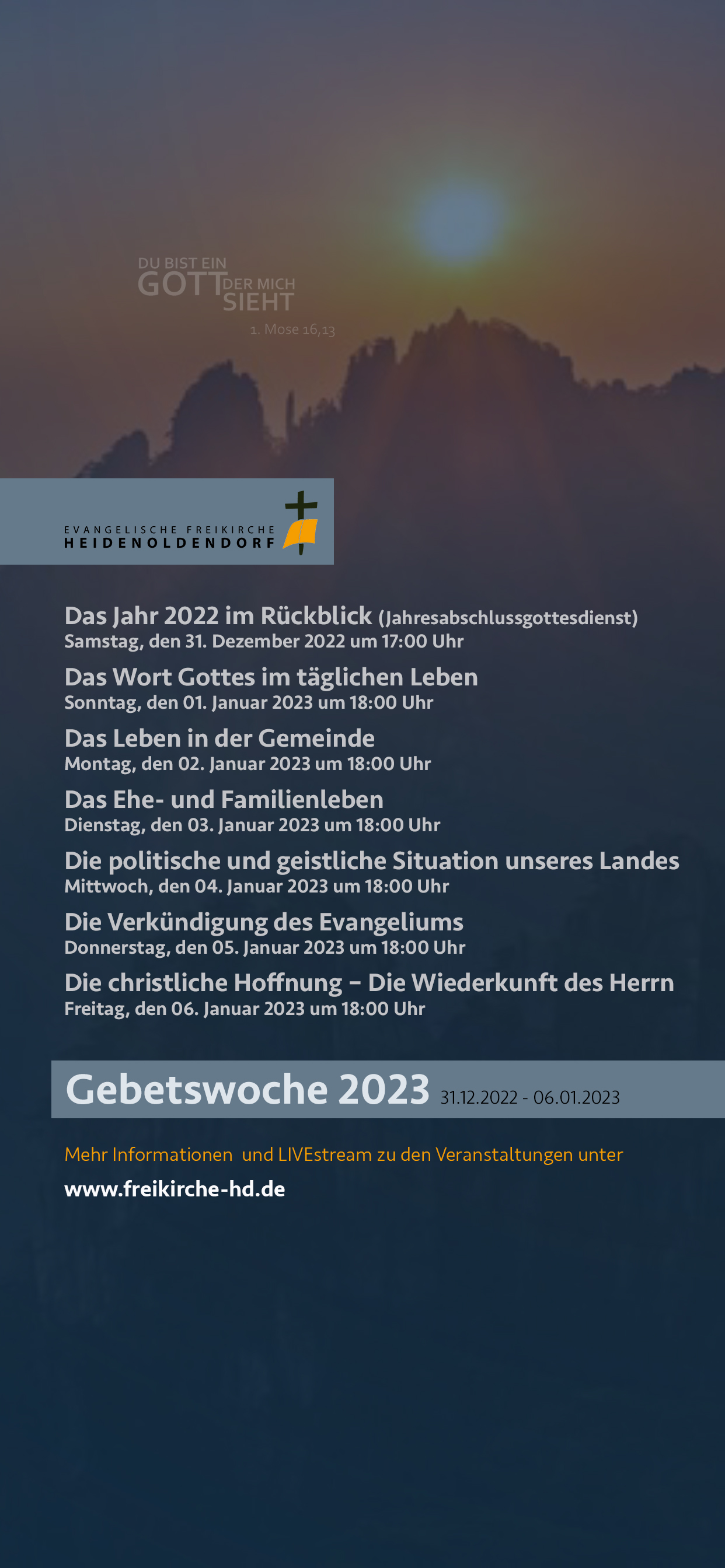Wie in den vergangenen Jahren beenden wir das alte und beginnen das neue Jahr mit Gebet! Auch und vielleicht gerade deshalb, weil wir in diesen Zeiten leben. Beginnend mit dem Silvester-Tag möchten wir in der Folge eine Woche jeden Tag zu verschiedenen Themen zusammen beten. Und dazu möchten wir Sie einladen! Nachfolgend die Übersicht der Veranstaltungen und die Möglichkeiten der Teilnahme:
