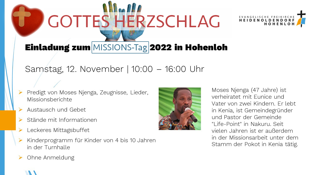 Am Samstag wird in der Evangelischen Freikirche Hohenloh der MISSIONS-Tag stattfinden. Alle aus der Gemeinde HD und HL sind dazu eingeladen. Alle Informationen entnehmt bitte dem rechts eingefügtem Bild. Wo die Evangelischen Freikirche Hohenloh findet, könnt ihr hier finden.