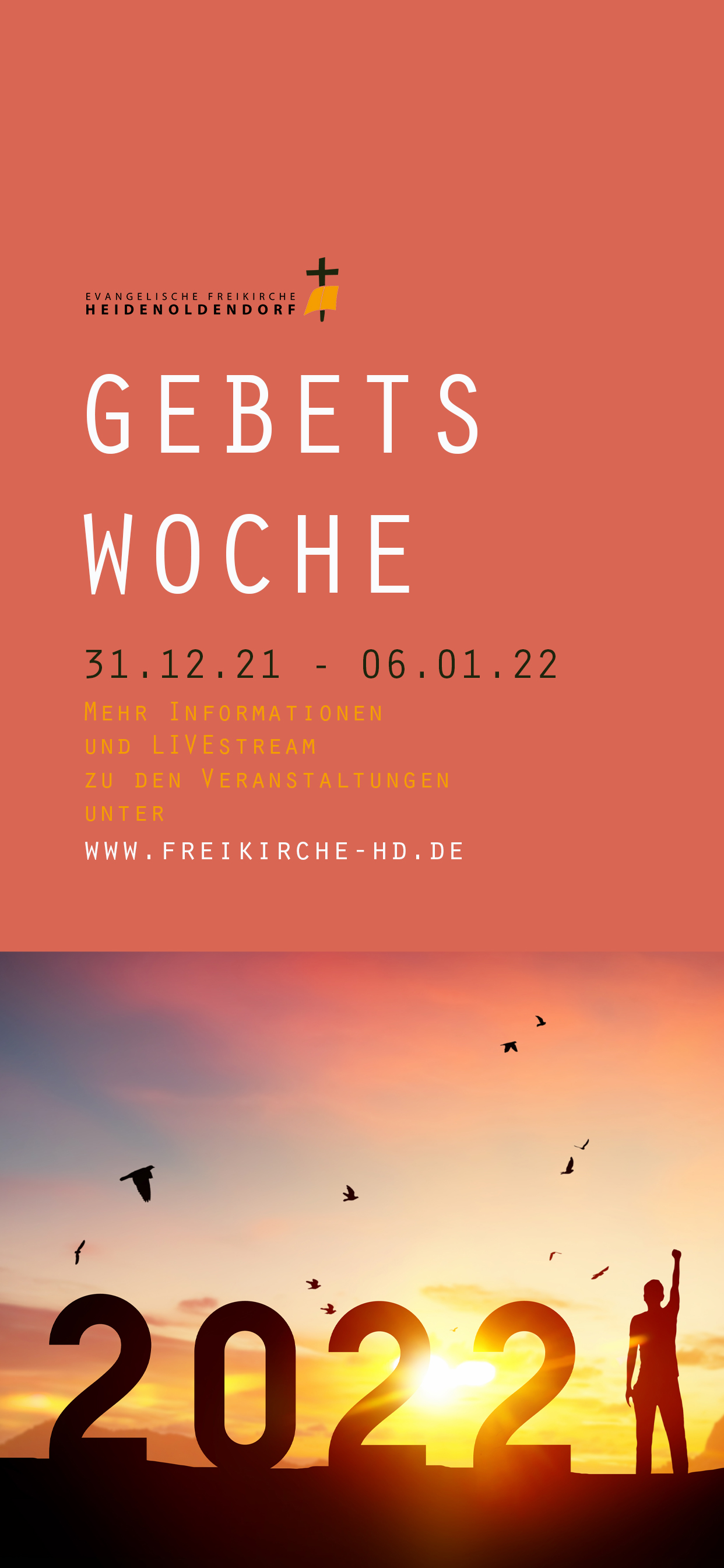 Update 01.01.2022 /// Ab dem zweiten Tag der Gebetswoche (am 01.01.22) entfällt die Anmeldung zu den Veranstaltungen. Im Saal wird es eine Veränderung der Sitzordnung geben, es werden nach dem „Schachbrettmuster“ die Plätze vergeben. Bitte beachtet dabei die Hinweise der Ordner. Alle anderen Vorgaben vom Update 15.12.21 bleiben weiterhin bestehen.